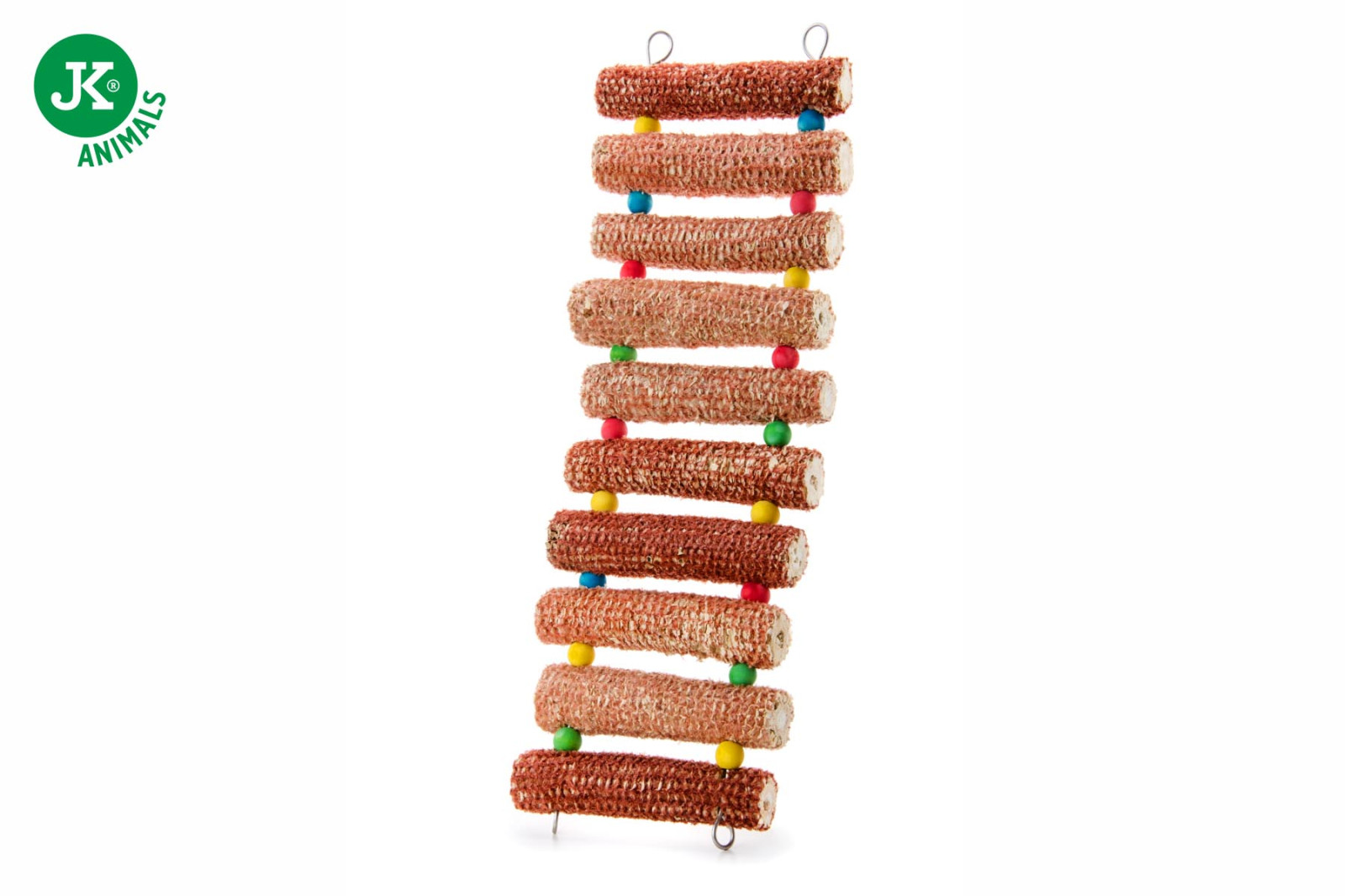 Hračka most z kukuřice a dřeva pro křečky, králíky a jiná malá zvířata. Délka 37 cm. Hračka z kukuřice a dřeva je navlečena na drátu, který můžete tvarovat například do oblouku. Díky čtyřem okům se dá hračka zavěsit do klece.