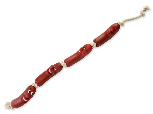Hračka veselé klobásy na provaze pro psy. Skvělá hračka a přetahovadlo zároveň. Je vyrobena z vinylu.