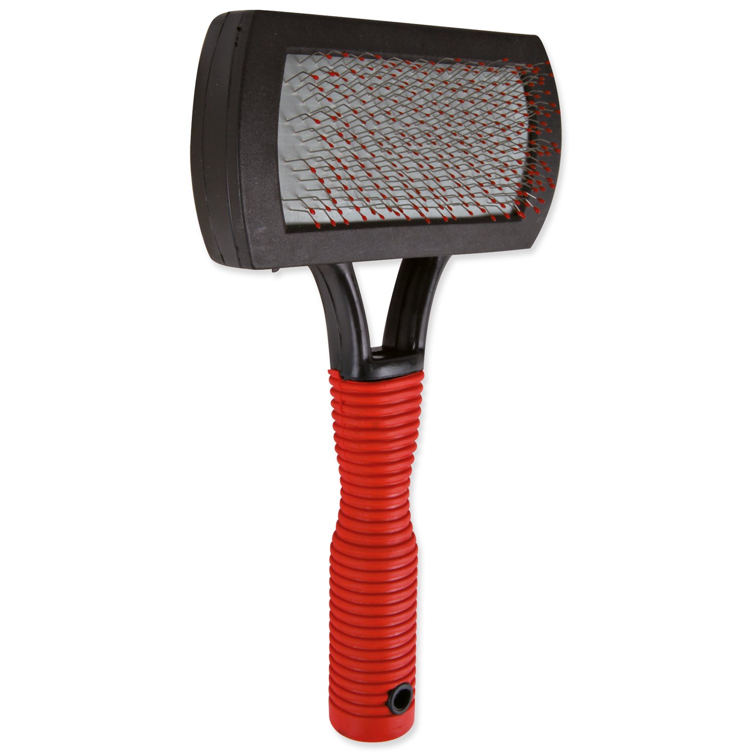 Kartáč s gumovou rukojetí a kovovými drátky na vyčesávání línajících chlupů. Velikost: 10 x 17 cm.