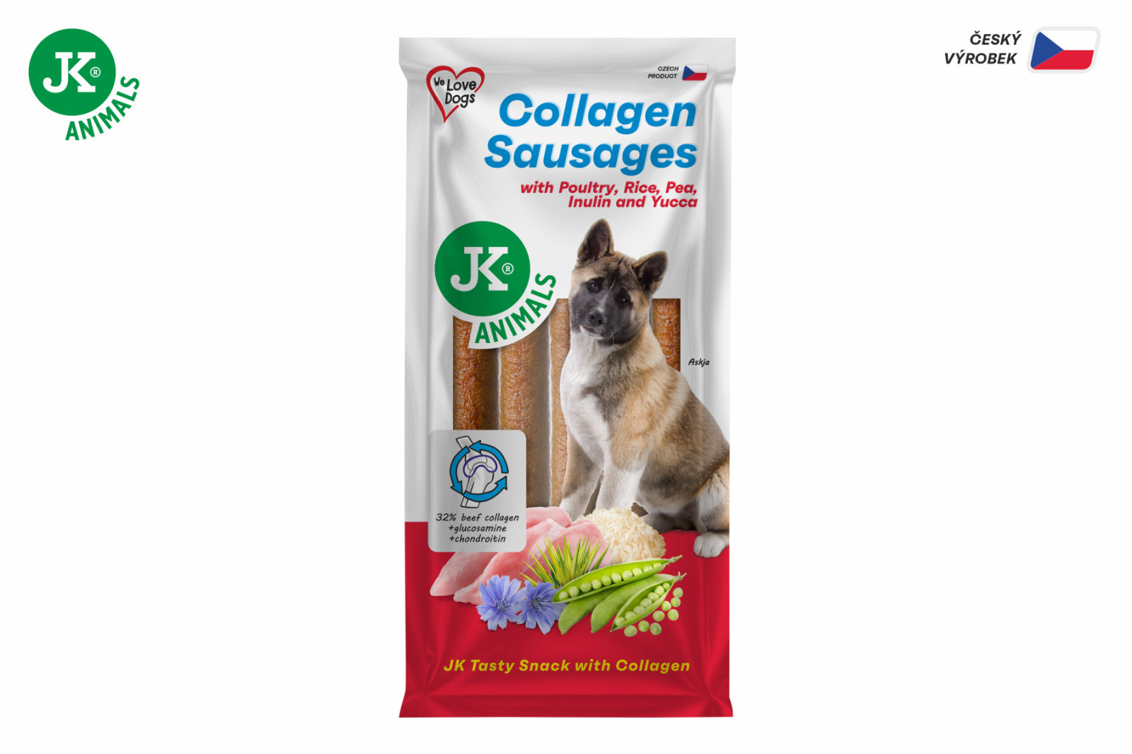 Chutné klobásy s drůbežím, kolagenem, rýží, hrachem, inulinem a yuccou. Doplňkové krmivo pro psy. Pamlsek pro psy.