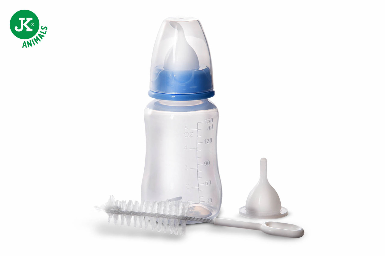 Kojící set pro štěňata a koťata. Obsahuje láhev na mléko, náhradní dudlík, čistící plastovou jehlu a kartáč.