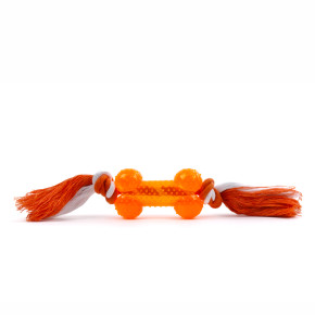 TPR - Bavlněný uzel s kostí - oranžový, odolná (gumová) hračka z termoplastické pryžeSkladem 10 ks40 Kč/ ks33 Kč bez DPH